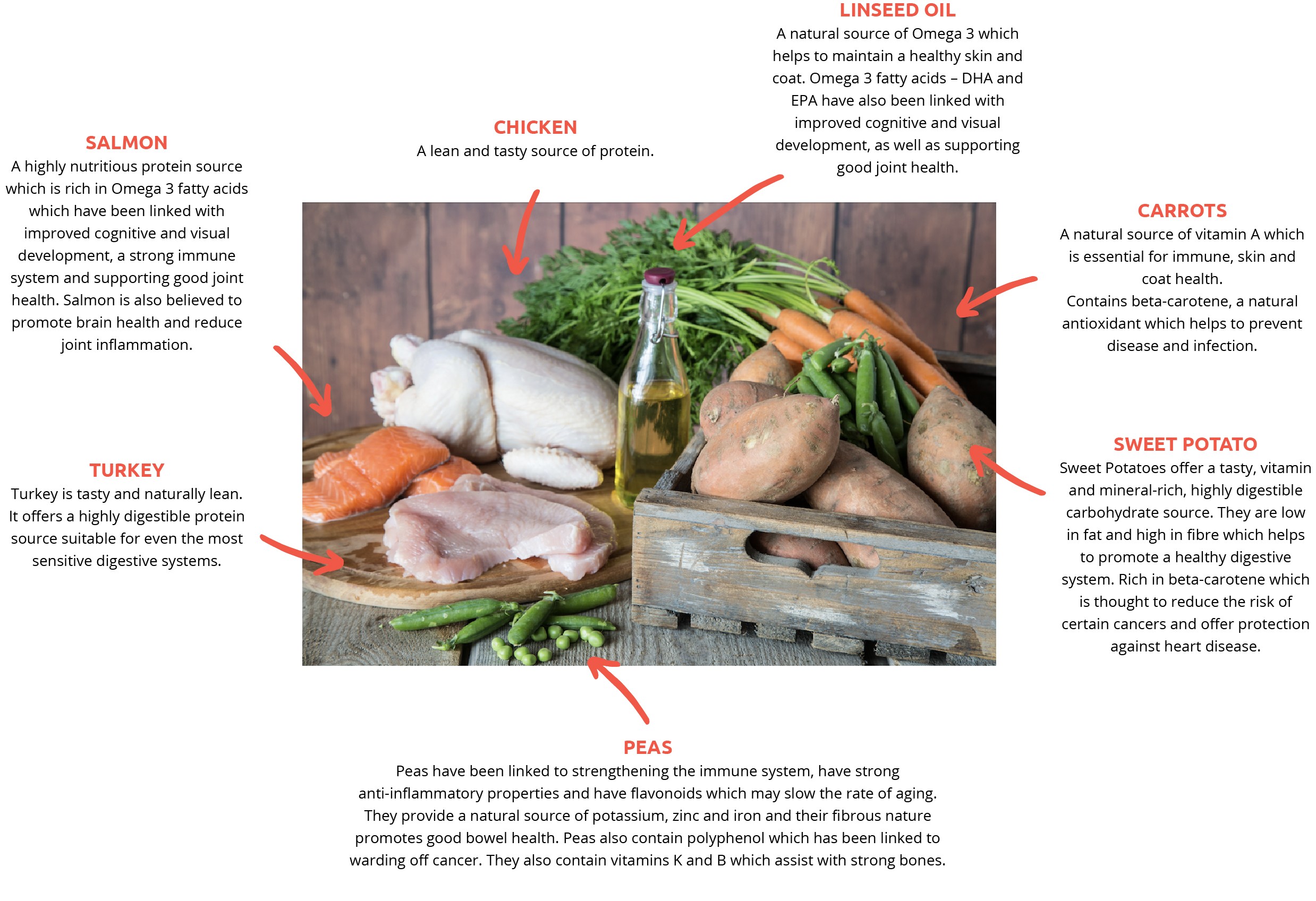 Chicken offers a lean and tasty source of protein which is highly digestible. Salmon is a very nutritious protein, rich in Omega-3 fatty acids which have been linked with improved cognitive and visual development, a strong immune system and supporting good joint health. Turkey is a particularly digestible protein source suitable for even the most sensitive digestive systems. Sweet potato offers a tasty and highly digestible complex carbohydrate high in B vitamins. Sugar beet is a natural source of dietary fibre promoting good intestinal transit time. We add Linseed oil and Omega-3 supplement to maintain healthy skin, coat, and joints, and support visual development and cognitive function. We add prebiotics to support the growth of healthy gut bacteria, aiding healthy digestion. Balanced calcium and phosphorus levels promote the development of strong teeth and bones, whilst added nucleotides support growing tissues. We add a carefully selected variety of vitamins and minerals to make this food a complete diet. We never add any artificial colours or preservatives, this recipe is naturally preserved with rosemary extract.